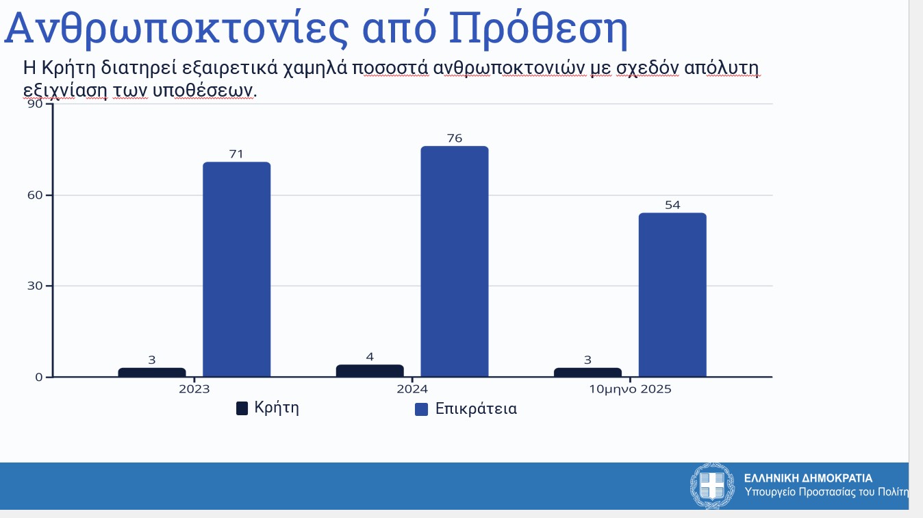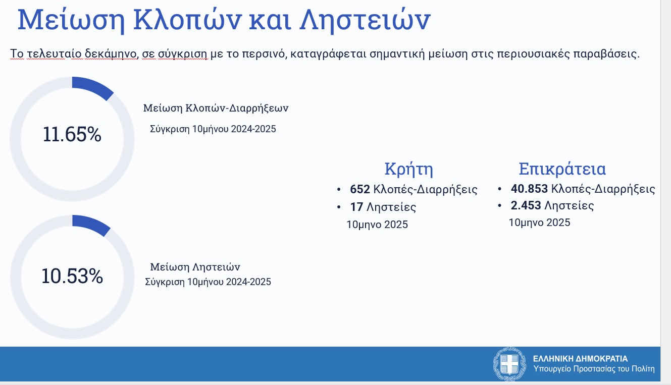 Θέλω να σας κάνω κοινωνούς της πραγματικότητας του νησιού σε ότι αφορά το ζήτημα της εγκληματικότητας και της παραβατικότητας. Η παραβατικότητα στην Κρήτη παρουσιάζει μια σταθερή μείωση, με χαμηλούς δείκτες σε σύγκριση με τα στοιχεία της Επικράτειας.
