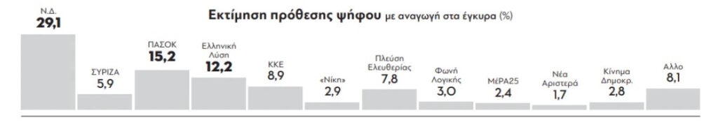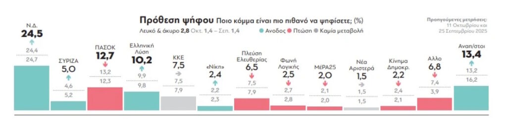 Ειδικότερα, ο πίνακας της πρόθεσης ψήφου παραμένει σχεδόν αμετάβλητος, με τη Ν.Δ. στο 24,5%, ακολουθεί το ΠΑΣΟΚ στη δεύτερη θέση, με 12,7% και την Ελληνική Λύση εδραιωμένη πλέον στην τρίτη θέση με ποσοστό 10,2%. Σταθερό το ΚΚΕ με 7,5%, ενώ συνεχίζεται η πτωτική πορεία για την Πλεύση Ελευθερίας, που ανιχνεύεται πλέον στο 6,5%.