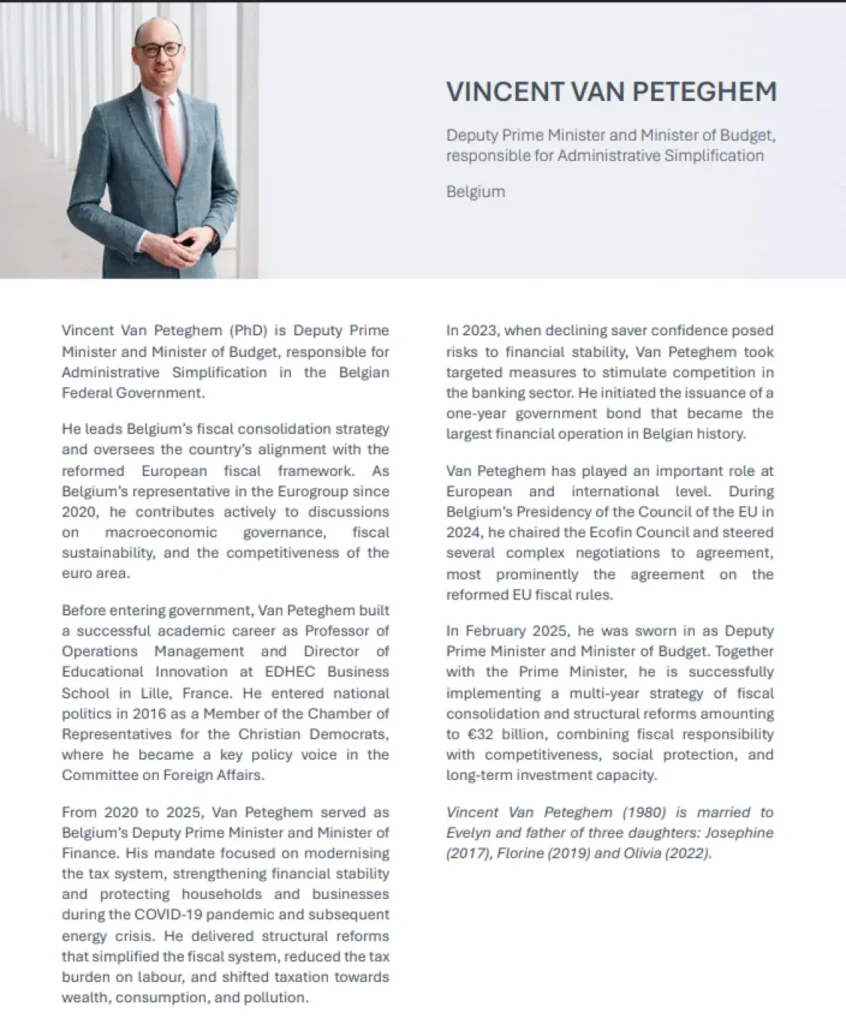 Ο Vincent Van Peteghem (PhD) είναι Αντιπρόεδρος της Κυβέρνησης και Υπουργός Προϋπολογισμού, υπεύθυνος για τη Διοικητική Απλούστευση στην Ομοσπονδιακή Κυβέρνηση του Βελγίου.