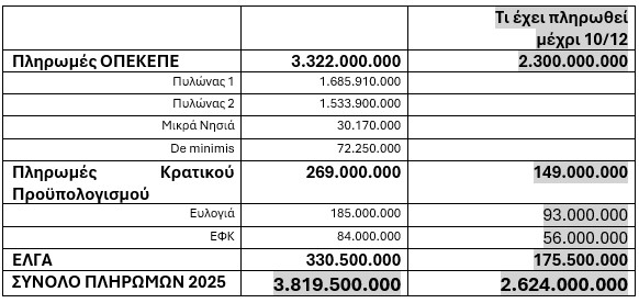 Κατά το διάστημα από 1η Ιανουαρίου έως 31 Δεκεμβρίου 2025 προβλέπεται ότι θα έχουν καταβληθεί στους αγρότες 3,8 δισ. ευρώ από τον ΟΠΕΚΕΠΕ, τον Κρατικό Προϋπολογισμό και τον ΕΛΓΑ.