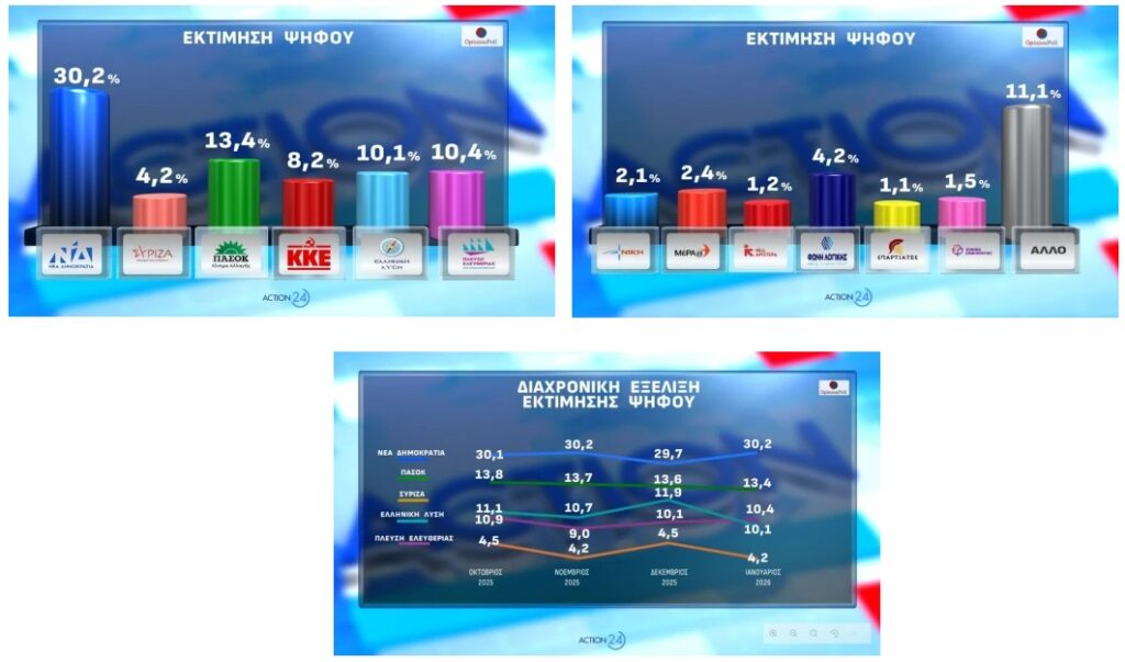 Ποσοστό 30,2% στην εκτίμηση ψήφου καταγράφει η ΝΔ στη δημοσκόπηση της Opinion Poll για λογαριασμό του Action 24, διατηρώντας προβάδισμα 16,8 ποσοστιαίων μονάδων έναντι του δεύτερου κόμματος. Το ΠΑΣΟΚ έρχεται δεύτερο με 13,4%, ενώ για την τρίτη θέση μάχονται η Πλεύση Ελευθερίας με 10,4% και η Ελληνική Λύση με 10,1%.