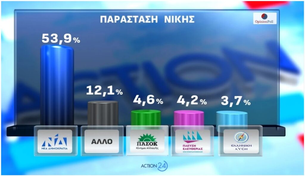 Στην παράσταση νίκης, η Ν.Δ. καταγράφει 53,9% και ακολουθεί η επιλογή «Άλλο» με 12,1%, το ΠΑΣΟΚ με 4,6%, η Πλεύση Ελευθερίας με 4,2% και η Ελληνική Λύση με 3,7%.