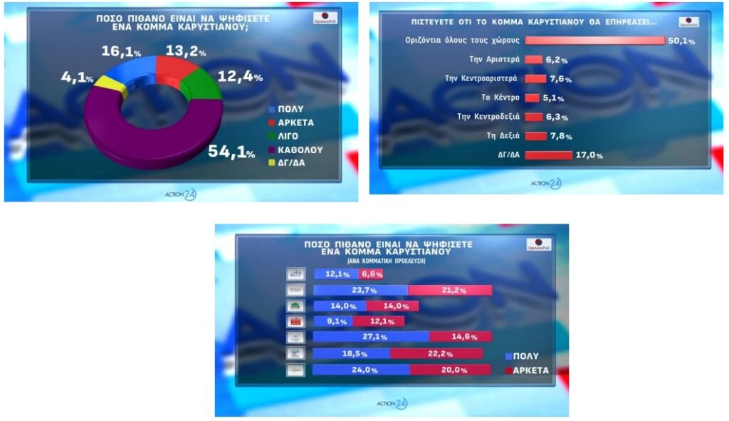Ιδιαίτερο ενδιαφέρον παρουσιάζουν τα ευρήματα για το υπό ίδρυση κόμμα της Μαρίας Καρυστιανού. Στην ερώτηση πόσο πιθανό είναι να το ψηφίσουν, το 16,1% των ερωτηθέντων στη δημοσκόπηση της Opinion Poll απαντά «πολύ» και το 13,2% «αρκετά». Το 12,4% απαντά «λίγο», το 54,1% «καθόλου» και το 4,1% δεν γνωρίζει ή δεν απαντά.