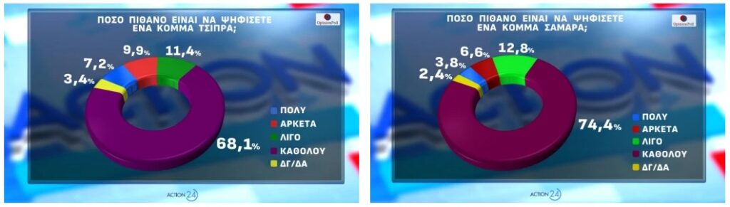 Αντίθετα, η προοπτική ενός κόμματος υπό τον Αλέξη Τσίπρα δεν φαίνεται να συγκινεί το εκλογικό σώμα. Μόλις το 7,2% δηλώνει ότι είναι «πολύ» πιθανό να το ψηφίσει και το 9,9% «αρκετά». Το 11,4% των συμμετεχόντων στη δημοσκόπηση της Opinion Poll απαντά «λίγο», ενώ η συντριπτική πλειονότητα του 68,1% απαντά «καθόλου». Το 3,4% δεν γνωρίζει ή δεν απαντά. Επίσης, ακόμη χαμηλότερη είναι η δυνητική επιρροή ενός πιθανού κόμματος υπό τον Αντώνη Σαμαρά. Το 3,8% απαντά «πολύ», το 6,6% «αρκετά», το 12,8% «λίγο» και το 74,4% «καθόλου». Ακόμα, το 2,4% απάντησε «δεν γνωρίζω/δεν απαντώ».