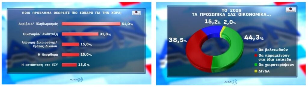 Η ακρίβεια και ο πληθωρισμός αποτελούν το σημαντικότερο πρόβλημα για τους πολίτες, με ποσοστό 51%. Έπειτα, στη δημοσκόπηση της Opinion Poll ακολουθεί η οικονομία και η ανάπτυξη με 31,8%, η απονομή Δικαιοσύνης και το κράτος Δικαίου με 15%, η διαφθορά επίσης με 15% και η κατάσταση στο ΕΣΥ με 13%. Σχετικά με τις οικονομικές προσδοκίες για το 2026, το 44,3% πιστεύει ότι τα προσωπικά του οικονομικά θα χειροτερέψουν, το 38,5% ότι θα μείνουν στα ίδια επίπεδα και μόλις το 15,2% ότι θα βελτιωθούν.