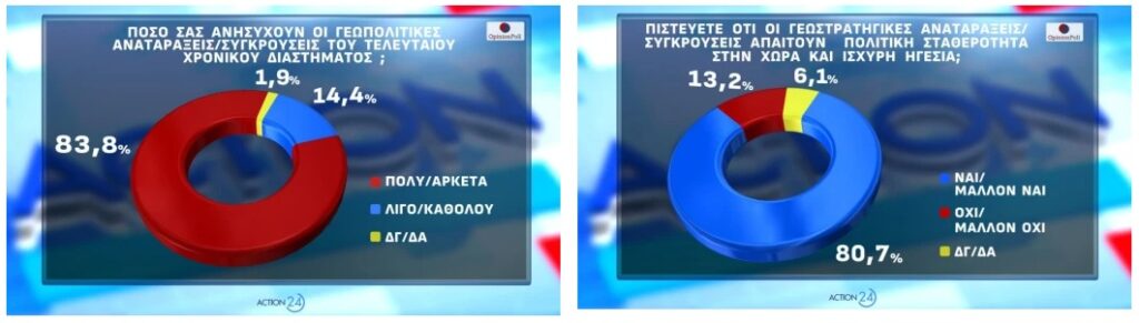Οι γεωπολιτικές αναταράξεις του τελευταίου χρονικού διαστήματος ανησυχούν πολύ ή αρκετά το 83,8% των ερωτηθέντων στη δημοσκόπηση της Opinion Poll. Μόλις το 14,4% δηλώνει ότι ανησυχεί λίγο ή καθόλου. Παράλληλα, το 80,7% πιστεύει ότι οι γεωστρατηγικές αναταράξεις απαιτούν πολιτική σταθερότητα στη χώρα και ισχυρή ηγεσία, ενώ αντίθετη άποψη έχει το 13,2%, ενώ το 6,1% δεν γνωρίζει ή δεν απαντά.