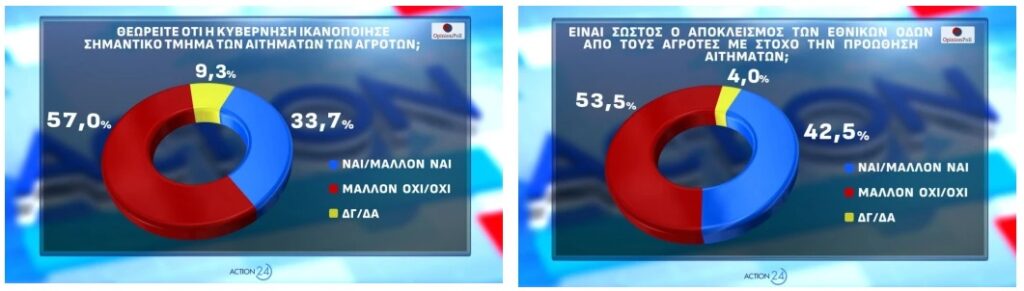 Στο ζήτημα των αγροτικών κινητοποιήσεων, το 42,5% θεωρεί σωστό τον αποκλεισμό των εθνικών οδών από τους αγρότες για την προώθηση των αιτημάτων τους, ενώ το 53,5% διαφωνεί. Ακόμα, το 57% πιστεύει ότι η κυβέρνηση δεν ικανοποίησε σημαντικό τμήμα των αιτημάτων των αγροτών, ενώ το 33,7% έχει την αντίθετη άποψη. Ταυτόχρονα, η στάση της αντιπολίτευσης στο αγροτικό κρίνεται λανθασμένη ή μάλλον λανθασμένη από το 66,6%, ενώ μόλις το 18,5% τη θεωρεί σωστή.