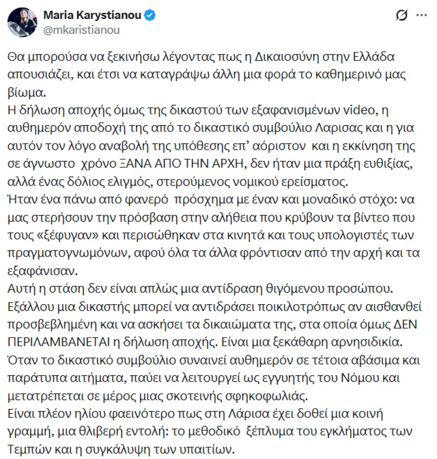 Η Μαρία Καρυστιανού έστρεψε τα βέλη της στον πρόεδρο της δίκης για τα «χαμένα» βίντεο Τεμπών και το δικαστικό συμβούλιο Λάρισας για «δόλιους ελιγμούς», ενώ υποστηρίζει ότι η δήλωση αποχής της δικαστή δεν είναι δικαίωμά της, αλλά «ξεκάθαρη αρνησιδικία».