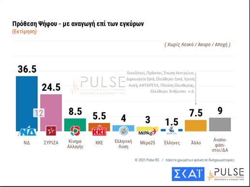 Η διαφορά διαμορφώνεται στο 12% στην εκτίμηση ψήφου (ΝΔ 36.5 και ΣΥΡΙΖΑ 24.5).