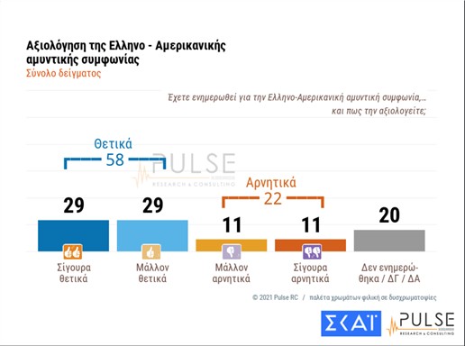 Ως προς την ελληνοαμερικανική αμυντική συμφωνία το 58% των ερωτηθέντων συνολικά την αξιολογεί σίγουρα θετικά ή μάλλον θετικά (από 29%), ενώ το 22% συνολικά αρνητικά (από 11%).