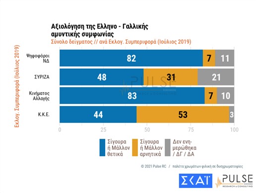 Για την ελληνογαλλική αμυντική συμφωνία το 65% των ερωτηθέντων συνολικά απαντά ότι την αξιολογεί σίγουρα θετικά (39%) ή μάλλον θετικά (26%), ενώ το 18% συνολικά μάλλον αρνητικά (10%) ή σίγουρα αρνητικά (8%).
