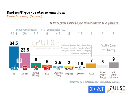 Διψήφια διαφορά της τάξης του 11% διατηρεί η Νέα Δημοκρατία έναντι του ΣΥΡΙΖΑ στην πρόθεση ψήφου, σύμφωνα με την δημοσκόπηση της PULSE που μετέδωσε ο ΣΚΑΙ στο κεντρικό δελτίο ειδήσεων με την Σία Κοσιώνη.