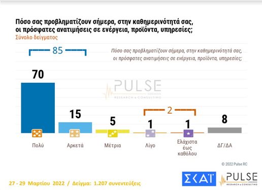 Πολύ και αρκετά προβληματισμένο δηλώνει το 85% (70%+15%) των πολιτών στην καθημερινότητά του από τις πρόσφατες ανατιμήσεις σε ενέργεια, προϊόντα και υπηρεσίες, σύμφωνα με την δημοσκόπηση της εταιρείας Pulse για λογαριασμό του ΣΚΑΪ.