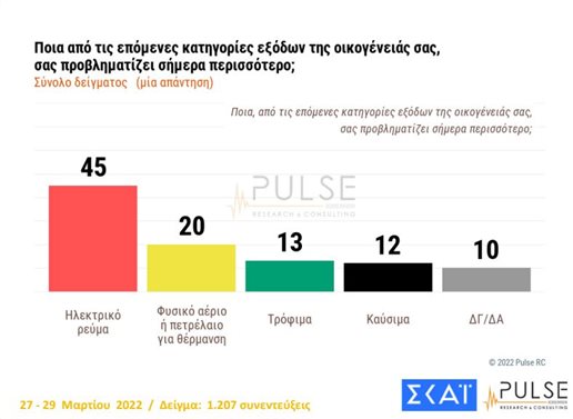 Στην ερώτηση ποια κατηγορία οικογενειακών εξόδων προκαλεί τον μεγαλύτερο προβληματισμό, το 45% απαντά το ρεύμα, το 20% η θέρμανση, το 13% τα τρόφιμα και το 12% τα καύσιμα.