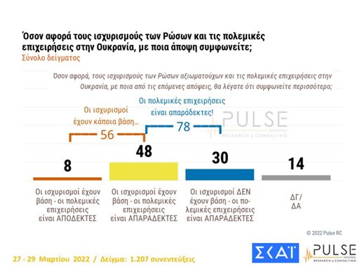 Τέλος, σε ερώτηση αν βρίσκουν βάσιμους ή αβάσιμους τους ρωσικούς ισχυρισμούς που οδήγησαν στον πόλεμο στην Ουκρανία, ένα 56% απαντά ότι οι ισχυρισμοί έχουν κάποια βάση, ενώ ένα 78% απαντά ότι οι πολεμικές επιχειρήσεις είναι απαράδεκτες.
