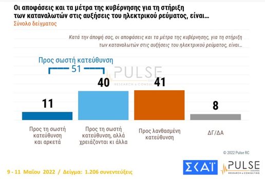 Θετικό είναι το αποτύπωμα των μέτρων που ανακοίνωσε η κυβέρνηση για την στήριξη νοικοκυριών και επιχειρήσεων απέναντι στην εκτίναξη του ενεργειακού κόστους, όπως προκύπτει από την δημοσκόπηση της εταιρείας Pulse.