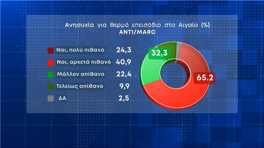 Σχετικά με το ενδεχόμενο να προκληθεί ένα θερμό επεισόδιο στο Αιγαίο το 24,3% το θεωρεί πολύ πιθανό, το 40,9% αρκετά πιθανό, το 22,4% μάλλον απίθανο, ενώ το 9,9% λέει πως το θεωρεί τελείως απίθανο. Αναφορικά με την στάση της κυβέρνησης στην αντιμετώπιση των μεταναστευτικών ροών το 64,1% των ερωτηθέντων υποστηρίζει ότι θα πρέπει να είναι πιο αυστηρή, ενώ το 23,4% θεωρεί ότι πρέπει να συνεχίσει όπως είναι σήμερα.