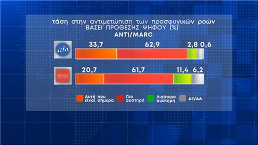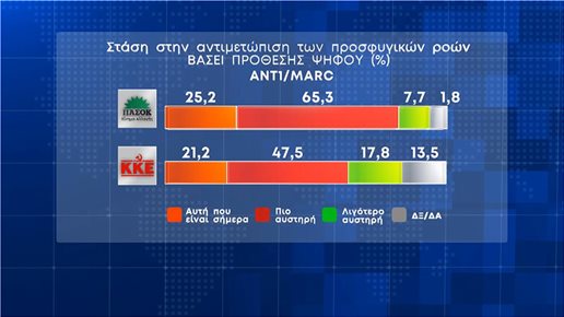 Το 8,1% απάντησε ότι θα πρέπει να είναι λιγότερο αυστηρή. Στην δημοσκόπηση παρουσιάστηκαν και ποσοστά για την στάση στην αντιμετώπιση των μεταναστευτικών ροών βάσει πρόθεσης ψήφου.