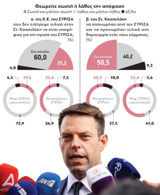 Ενα χαρακτηριστικό παράδειγµα είναι η στάση απέναντι στην απόφαση της Κεντρικής Επιτροπής να µην επιτρέψει στον κ. Κασσελάκη να είναι υποψήφιος: Η συγκεκριµένη απόφαση κρίνεται από την πλειοψηφία των ψηφοφόρων αρνητικά, µε διαφορετική όµως ένταση µεταξύ όσων είχαν ψηφίσει στις ευρωεκλογές, όπου η αρνητική τοποθέτηση καταγράφεται στο 75,9%, ενώ µεταξύ όσων παραµένουν στο κόµµα το αντίστοιχο ποσοστό είναι 56,9%.