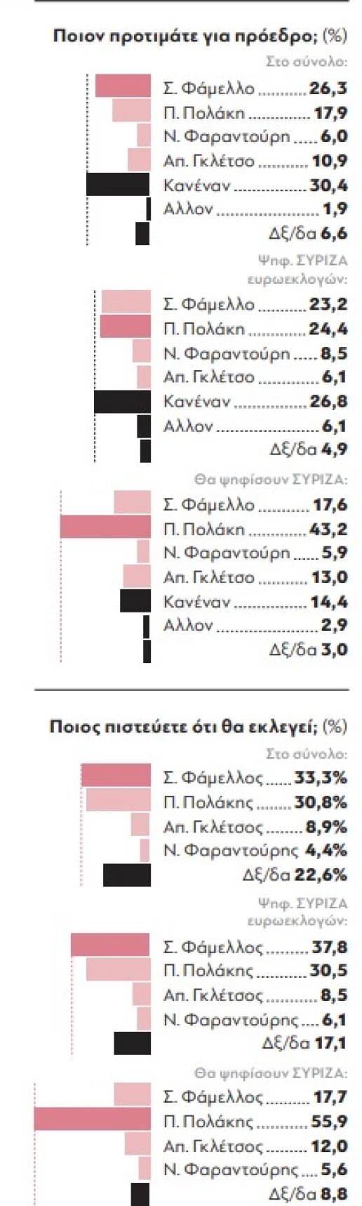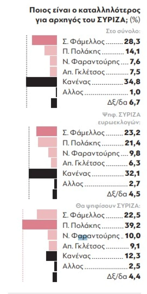 Η αντίφαση που περιγράψαµε παραπάνω γίνεται ακόµα πιο έντονη στην προσπάθεια να αποκρυπτογραφήσουµε τις προτιµήσεις των ψηφοφόρων του ΣΥΡΙΖΑ για την επικείµενη εκλογική διαδικασία. ∆ιαµορφώνεται λοιπόν ένα περιβάλλον στο οποίο µεταξύ των ψηφοφόρων των ευρωεκλογών έχουµε µια αµφίρροπη µάχη µεταξύ των κ. Πολάκη και Φάµελλου, η οποία όµως αποκτά πολύ ξεκάθαρο φαβορί, τον κ. Πολάκη, όταν επικεντρώνεται στους σηµερινούς ψηφοφόρους του κόµµατος. Είναι ξεκάθαρο λοιπόν ότι αυτό που θα καθορίσει την τελική εκλογική έκβαση είναι η σύνθεση του σώµατος που θα λάβει τελικά µέρος στη διαδικασία.