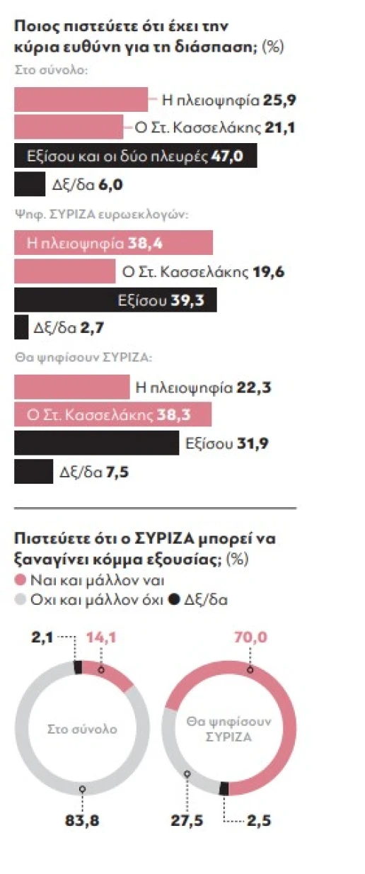 Οσον αφορά την πλευρά που ευθύνεται κυρίως για τη διάσπαση, οι ψηφοφόροι των ευρωεκλογών δείχνουν προς την πλευρά της πλειοψηφίας, ενώ οι σηµερινοί ψηφοφόροι επιρρίπτουν ευθύνες κυρίως στην πλευρά Κασσελάκη. Το καινούργιο στοιχείο που αναδεικνύεται είναι η αποτύπωση της δεξαµενής που διαθέτει το υπό ίδρυση κόµµα, το οποίο θεωρεί πολύ και αρκετά πιθανό να ψηφίσει το 8,3% του συνόλου και το 27,7% των ψηφοφόρων του ΣΥΡΙΖΑ. Να επισηµάνουµε ότι τα συγκεκριµένα ποσοστά δεν αποτελούν πρόθεση ψήφου, αλλά καταγραφή των δυνητικών ορίων του κόµµατος.