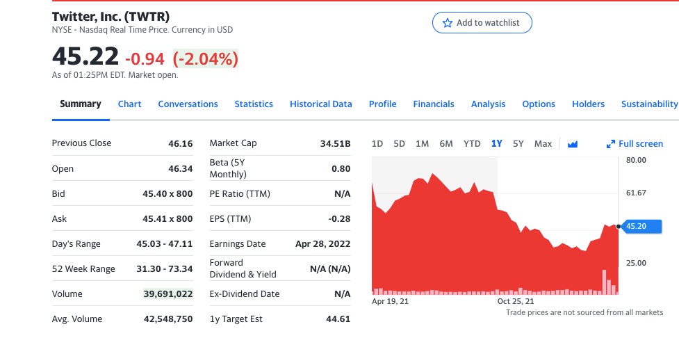 Ως γνωστόν, στις αρχές Απριλίου, ο δισεκατομμυριούχος Μασκ, πλουσιότερος άνθρωπος στον πλανήτη, γνωστοποίησε πως απέκτησε μετοχικό ποσοστό 9,2% στο Twitter (ή 73 εκατ. μετοχές). Ο Παράγκ Αγκραουάλ ανακοίνωσε πως ο Μασκ επρόκειτο να ενταχθεί στο διοικητικό συμβούλιο της εταιρείας, αλλά ο δισεκατομμυριούχος υπαναχώρησε, αρνούμενος τη συμμετοχή, πυροδοτώντας σενάρια για επιθετική εξαγορά.