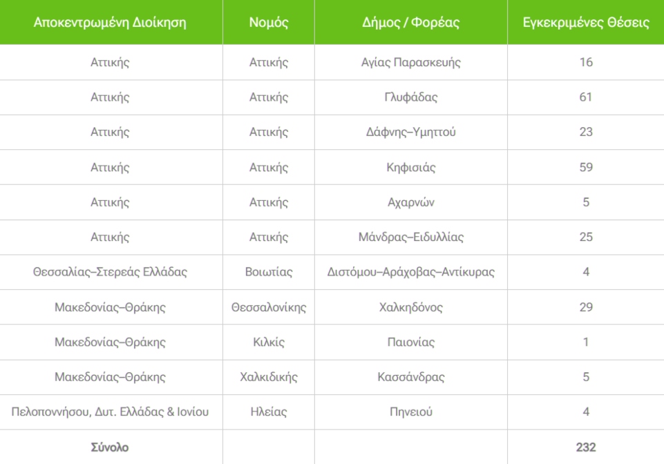 Αναλυτικός πίνακας με τους δήμους και τον αριθμό των εγκεκριμένων θέσεων