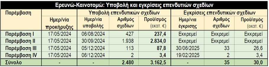 Από την άλλη πλευρά στην Παρέμβαση Ι, «Έρευνα και Ανάπτυξη από Επιχειρήσεις» που στόχο έχει να ενισχυθεί η ερευνητική δραστηριότητα στο εσωτερικό των επιχειρήσεων, τα επενδυτικά σχέδια ήταν λιγότερα, 427 και με αιτούμενο προϋπολογισμό 247 εκατ. ευρώ.