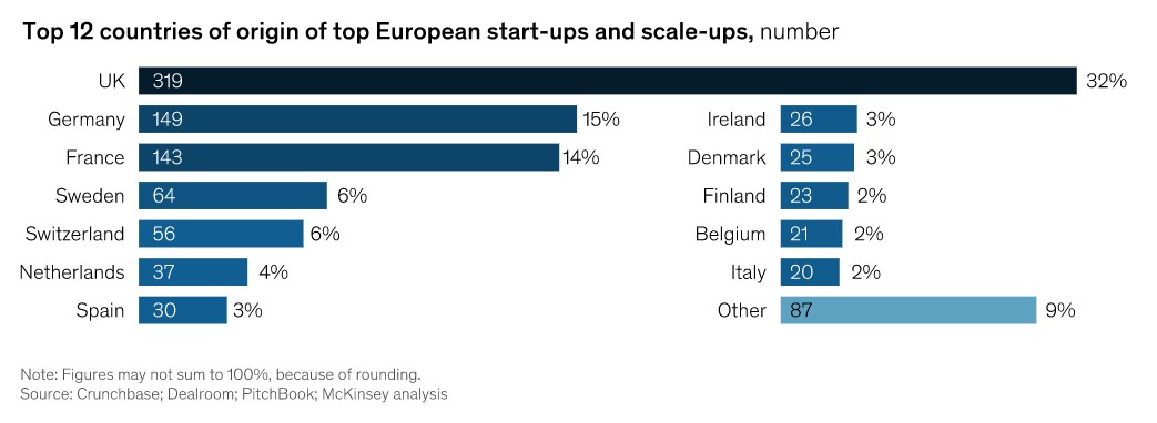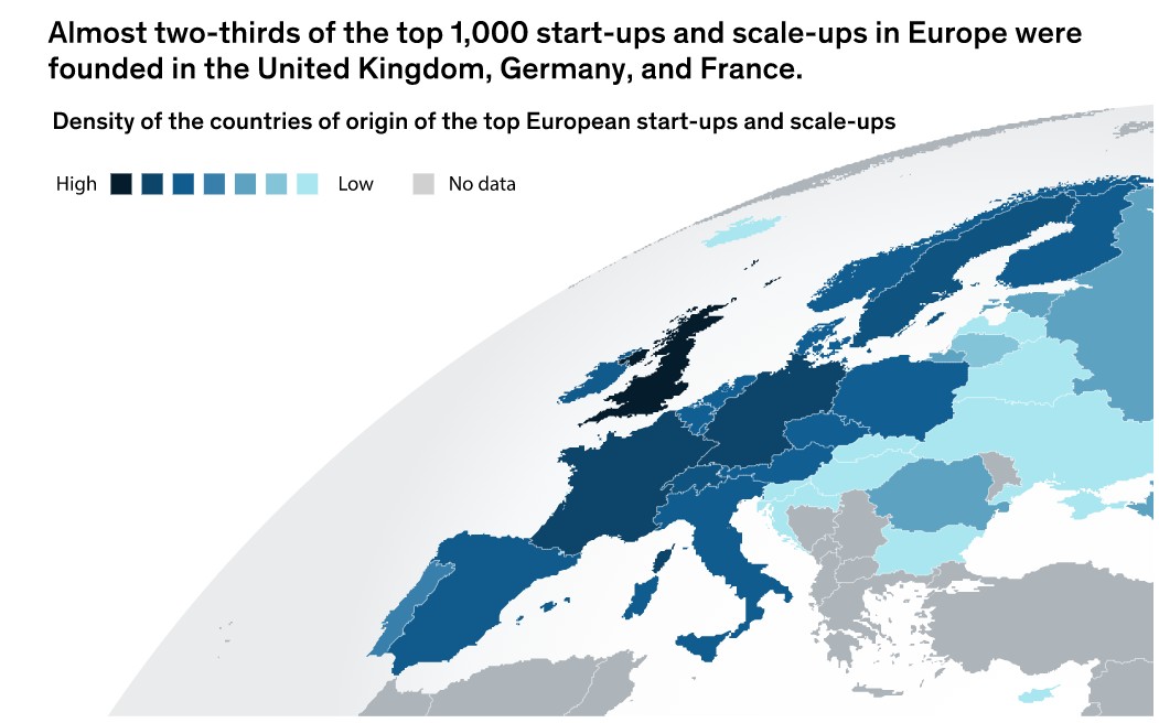 Συνολικά, Μεγάλη Βρετανία, Γερμανία και Γαλλία δημιούργησαν τα 2/3 των πιο δυναμικών νεοφυών επιχειρήσεων της Ευρώπης. Την παραπάνω εικόνα αποτυπώνει έρευνα της Mc Kinsey, η οποία μελέτησε τις κορυφαίες 1.000 νεοσύστατες επιχειρήσεις της Ευρώπης, για να διαπιστώσει ποια είναι τα πιο ισχυρά στρατηγικά κέντρα της Ευρώπης στην παραγωγή startups εταιρειών.