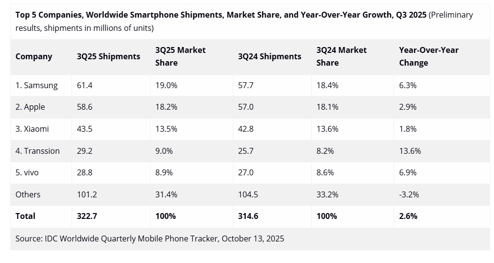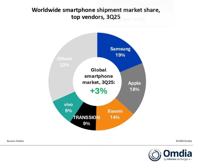 Η Omdia επιβεβαιώνει τη δυναμική αυτή, καταγράφοντας 3% αύξηση σε ετήσια βάση το ίδιο τρίμηνο. Η Samsung διατήρησε την κορυφή με 19% μερίδιο αγοράς, ακολουθούμενη από την Apple με 18%, τη Xiaomi με 14%, και τις Transsion και vivo με 9% η καθεμία.