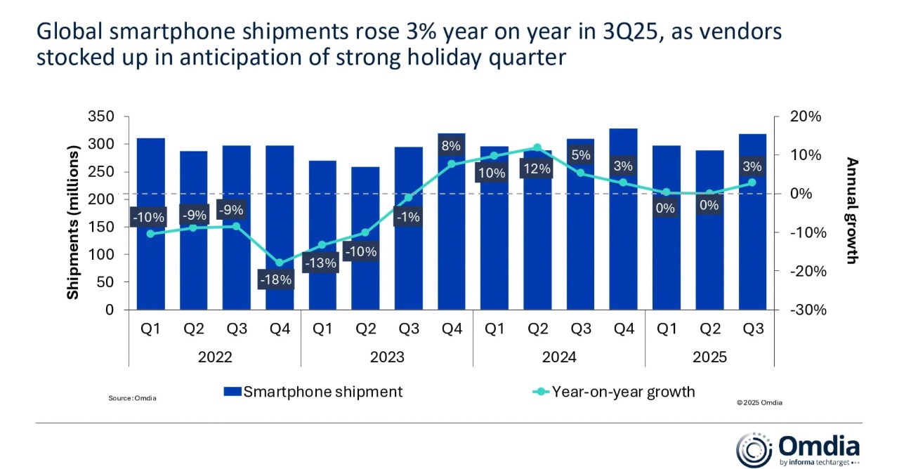 Η IDC αποτιμά τις αποστολές smartphones το τρίτο τρίμηνο του 2025 στα 322,7 εκατομμύρια τεμάχια, με την αγορά να δείχνει σημάδια σταθερής ανάκαμψης. Οι καταναλωτές επιστρέφουν στις αναβαθμίσεις, παρακινούμενοι από πιο προσιτά μοντέλα με δυνατότητες AI, αλλά και από έξυπνες χρηματοδοτικές λύσεις και προγράμματα ανταλλαγής που κάνουν την απόφαση για νέο κινητό «no brainer».