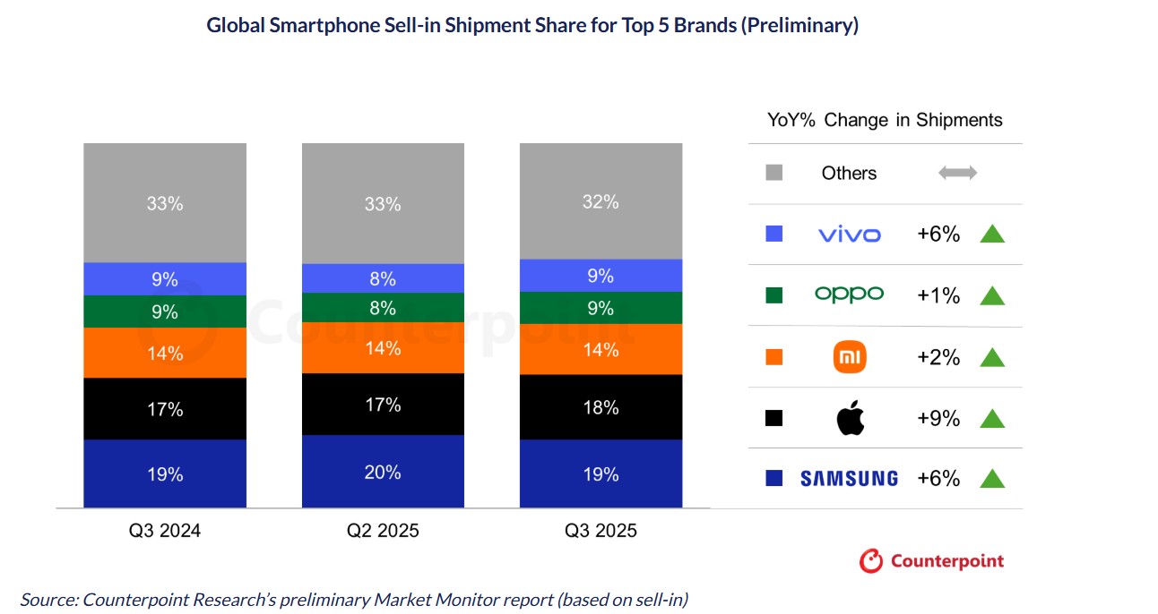 Η Samsung παραμένει στην πρώτη θέση με 19% μερίδιο και 6% ετήσια ανάπτυξη, χάρη στα Galaxy A17 και A07, αλλά και την ισχυρή δυναμική των foldables. Η Apple ακολουθεί με 9% αύξηση αποστολών, την υψηλότερη μεταξύ των κορυφαίων πέντε, χάρη στην εξαιρετική υποδοχή της σειράς iPhone 17 σε Ιαπωνία, Κίνα και Δυτική Ευρώπη.