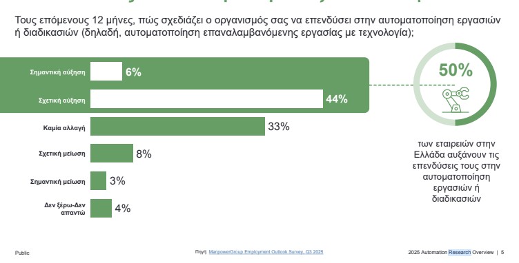Μία στις δύο ελληνικές επιχειρήσεις (50%) δηλώνει σήμερα ότι σκοπεύει να αυξήσει τις δαπάνες για αυτοματοποίηση εργασιών και διαδικασιών τον επόμενο χρονο. Πρόκειται για ποσοστό μικρότερο μεν του παγκόσμιου μέσου όρου του 61%, το οποίο, ωστόσο, δείχνει ότι και το ελληνικό επιχειρείν εμφανίζεται αποφασισμένο να μην χάσει το τρένο της αυτοματοποίησης. Μάλιστα, σύμφωνα με τη νέα διεθνή έρευνα της ManpowerGroup, υπάρχουν κλάδοι, οι οποίοι είναι εξαιρετικά κινητικοί προς αυτήν την κατεύθυνση.