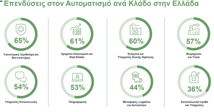 Παγκοσμίως, έξι στις δέκα (61%) επιχειρήσεις σχεδιάζουν να αυξήσουν τις επενδύσεις τους στην αυτοματοποίηση εργασίας και διαδικασιών μέσα στους επόμενους 12 μήνες. Οι μεγαλύτερες επενδύσεις αναμένονται στους κλάδους των Υπηρεσιών Επικοινωνίας (71%), της Πληροφορικής (70%), των Χρηματοοικονομικών Υπηρεσιών και του Real Estate (67%), της Ενέργειας και των Υπηρεσιών Κοινής Ωφέλειας (65%), καθώς και των Μεταφορών, των Logistics και της Αυτοκινητοβιομηχανίας (65%). Ακολουθούν η Βιομηχανία (59%), η Υγειονομική Περίθαλψη και οι Βιο-επιστήμες (57%), καθώς και τα Καταναλωτικά Αγαθά και οι Υπηρεσίες (54%).