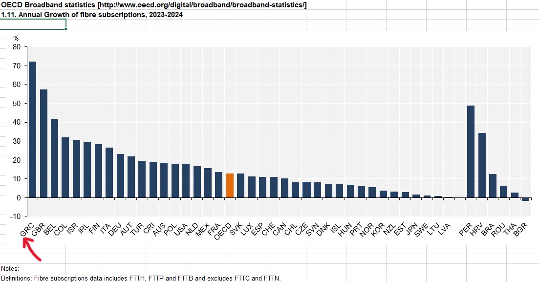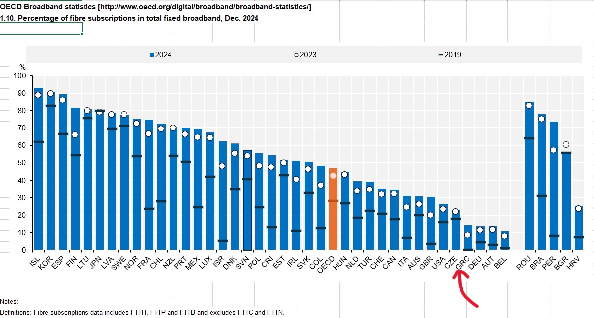 To 2019 μόλις το 0,2% των ευρυζωνικών συνδέσεων της χώρας μας ήταν βασισμένες σε οπτικές ίνες και το 99,8% βασίζονταν σε χάλκινα καλώδια. Στο τέλος του 2024 το ποσοστό των τηλεπικοινωνιακών συνδέσεων οπτικών ινών ανήλθε σε 14,2% και των χάλκινων συνδέσεων σε 85,8%. Η μεταβολή αυτή μας έφερε από την τελευταία θέση που ήμασταν στη ζώνη του ΟΟΣΑ το 2019 στην τέταρτη από το τέλος θέση το 2024.