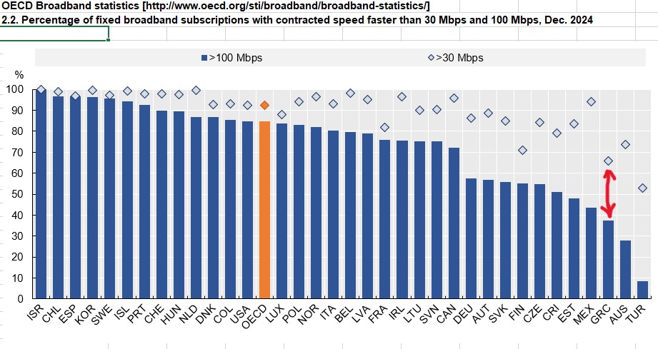 Η καθυστέρηση της χώρας μας στη δημιουργία οπτικών ινών φαίνεται και από τα στοιχεία των συνδέσεων που διαθέτουν ταχύτητες άνω των 100 Mbps. Στην Ελλάδα στο τέλος του 2024 μόνον το 37,4% των ευρυζωνικών συνδέσεων λειτουργούσαν με ταχύτητα άνω των 100 Mbps, έναντι 84,9% που ήταν ο μέσος όρος του ΟΟΣΑ.