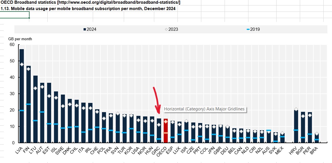 Στην κινητή ευρυζωνικότητα η Ελλάδα βρίσκεται κοντά στον μέσο όρο του ΟΟΣΑ. Η κατανάλωση δεδομένων (GB) μέσω κινητού αυξήθηκε σημαντικά την τελευταία 5ετία και από 2,3 GB ανά χρήστη και ανά μήνα, που ήταν το 2019, πέρυσι βρέθηκε σε 14,9 GB. Φτάσαμε έτσι στο 100% του μέσου όρου του ΟΟΣΑ (14,8 GB), από λιγότερο από 40% που ήμασταν το 2019.