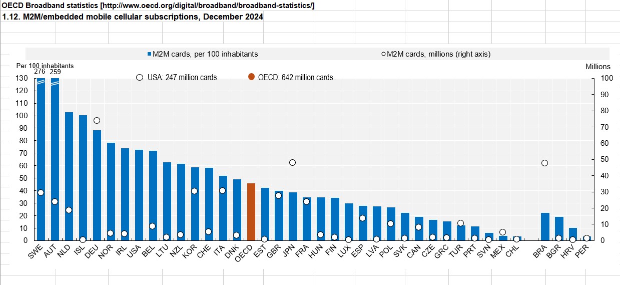 Στην Ελλάδα, στο τέλος του 2024, σύμφωνα με τον ΟΟΣΑ, λειτουργούσαν 1,6 εκατ. M2M συνδέσεις, που αντιστοιχούσαν στο 15,6% του πληθυσμού της χώρας. Η επίδοση αυτή μας έφερε στην 30ή θέση των χωρών του ΟΟΣΑ σε σύνολο 35 χωρών. Στις 35 χώρες του ΟΟΣΑ λειτουργούσαν 641 εκατ. συνδέσεις Μ2Μ, που αντιστοιχούσαν περίπου στο 46% στο συνολικού πληθυσμού. Οι χώρες με τις υψηλότερες επιδόσεις στους δείκτες αυτούς ήταν η Σουηδία και η Αυστρία, οι οποίες λειτουργούσαν υπερτριπλάσιο αριθμό συνδέσεων από τον πληθυσμό τους.