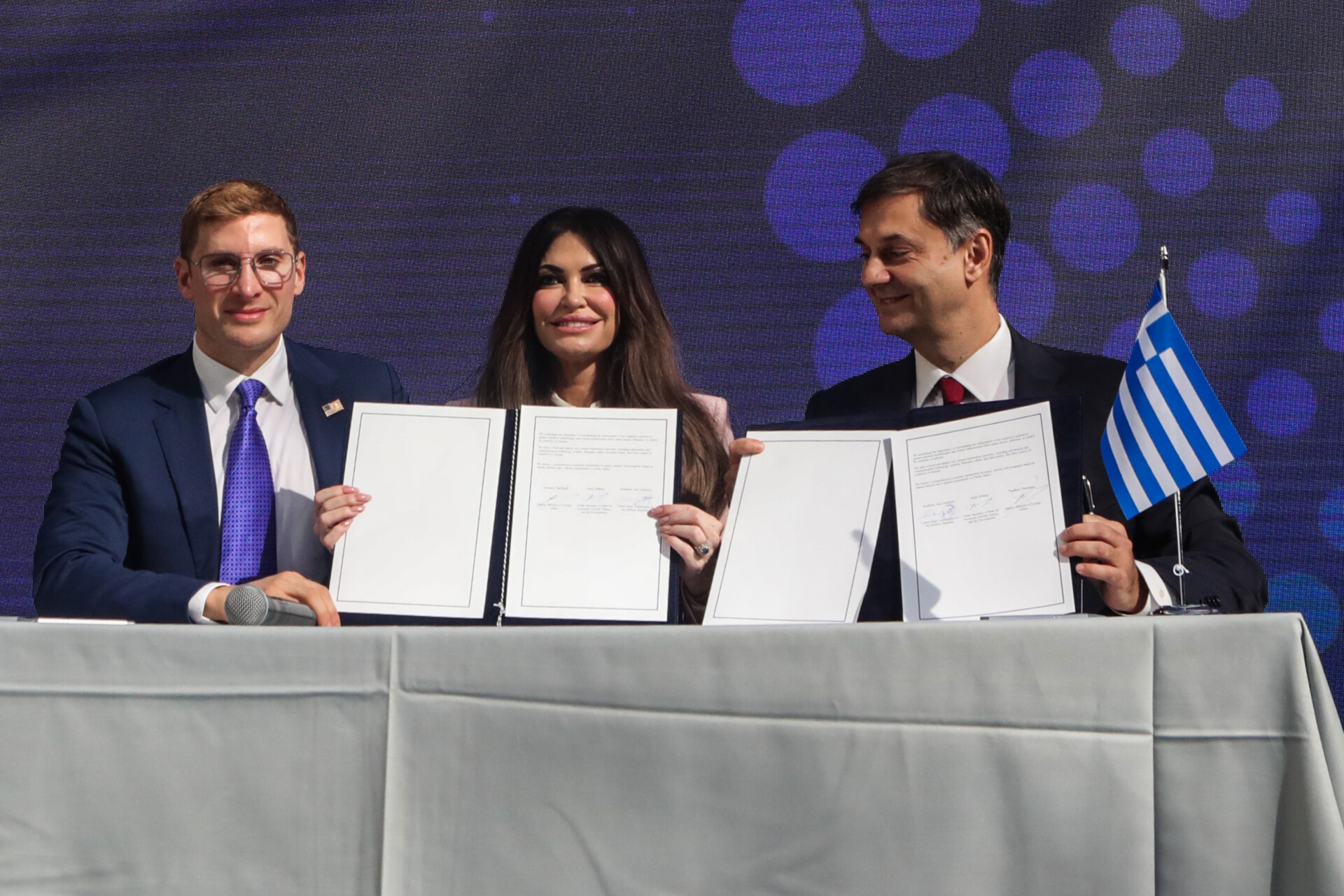 Κοινή Διακήρυξη για την ενίσχυση της οικονομικής συνεργασίας Ελλάδας – ΗΠΑ εστιάζοντας σε θέματα Τεχνητής Νοημοσύνης, υπέγραψαν σήμερα στο Ζάππειο ο υφυπουργός Εξωτερικών, Χάρης Θεοχάρης, ο υφυπουργός για την οικονομική ανάπτυξη, την ενέργεια και το περιβάλλον των ΗΠΑ Jacob Helberg, και η πρέσβης των ΗΠΑ στην Ελλάδα Kimberly Guilfoyle.