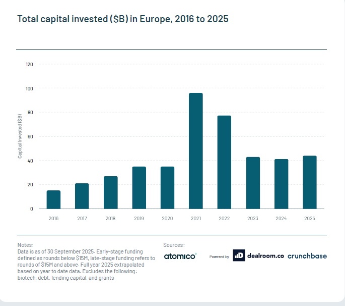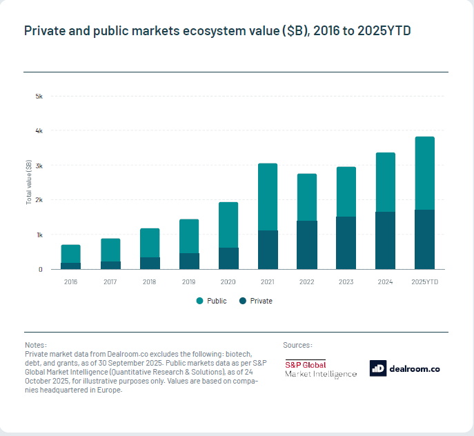 Η έρευνα State of European Tech 2025 της Atomico δείχνει ότι η ήπειρος έχει διανύσει τεράστια απόσταση προς αυτή την κατεύθυνση. Μέσα σε μια δεκαετία, η συνολική αξία της ευρωπαϊκής τεχνολογικής σκηνής εκτινάχθηκε από τα επίπεδα κάτω του 1 τρισ. δολ. σε περίπου 4 τρισ. δολ. το 2025 και οι επενδύσεις έχουν αυξηθεί πάνω από δέκα φορές.