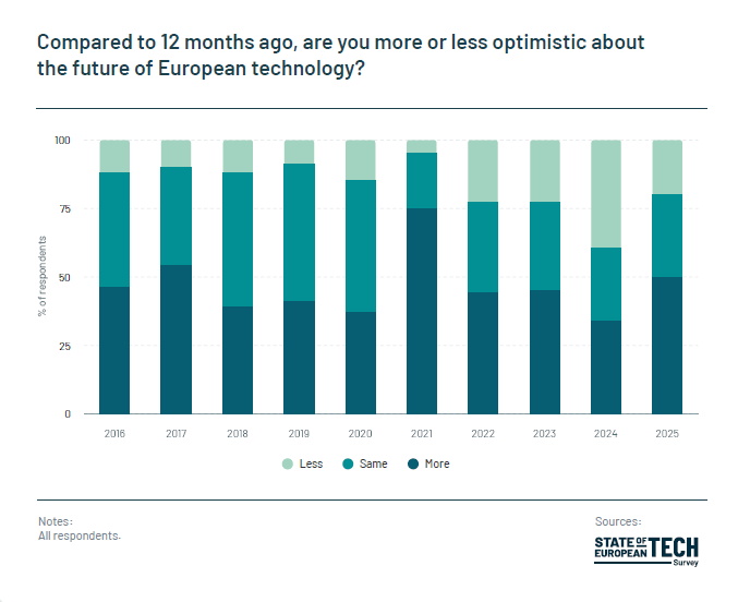 Η ευρωπαϊκή τεχνολογική κοινότητα εμφανίζεται σήμερα πιο αισιόδοξη από ποτέ. Το 50% των συμμετεχόντων στην έρευνα της Atomico του 2025 δηλώνει ότι βλέπει το μέλλον πιο αισιόδοξο, έναντι 34% το 2024. Η άνοδος της ΑΙ τροφοδοτεί αυτή την αλλαγή κλίματος, καθώς όλο και περισσότεροι ιδρυτές εταιρειών τεχνητής νοημοσύνης επιλέγουν να χτίσουν τις εταιρείες τους στην Ευρώπη.
