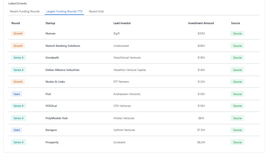 Η ανάλυση των μεγαλύτερων γύρων χρηματοδότησης από τις αρχές του έτους αναδεικνύει τους πρωταγωνιστές της αγοράς. Η Numan, η ψηφιακή πλατφόρμα υγειονομικής περίθαλψης του Έλληνα επιχειρηματία Σωκράτη Παπαφλωράτου, ηγήθηκε το 2025 με 30 εκατ. δολ. σε growth χρηματοδότηση.