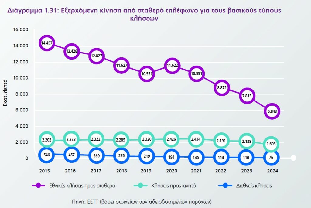 Σύμφωνα με την Επισκόπηση Αγορών που παρουσίασε η Εθνική Επιτροπή Τηλεπικοινωνιών & Ταχυδρομείων (ΕΕΤΤ) για το 2024, η υπηρεσία της σταθερής τηλεφωνίας υποχώρησε κατά μήκος όλων των κατηγοριών κλήσεων. Οι εθνικές κλήσεις υποχώρησαν σε διάρκεια πέρυσι 25,2%, οι κλήσεις προς κινητό κατά 21% και οι διεθνείς κλήσεις κατά 31%. Συνολικά ο όγκος της εξερχόμενης κίνησης από σταθερό σημείωσε υποχώρηση 24%.