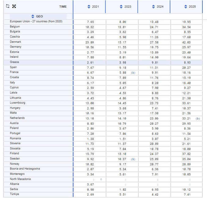 Στην ευρωπαϊκή κατάταξη, η Ελλάδα βρίσκεται πλέον κοντά στον πάτο, δίπλα σε χώρες όπως η Ρουμανία (5,2%), η Πολωνία (8,4%) και η Βουλγαρία (8,5%). Το στοιχείο αυτό αποκτά ιδιαίτερη βαρύτητα, καθώς το 2021 η Ελλάδα βρισκόταν σε παρόμοια χαμηλά επίπεδα (2,6%), χωρίς ωστόσο να έχει καταφέρει τα επόμενα χρόνια να καλύψει το χάσμα που άνοιξε με την υπόλοιπη Ευρώπη.