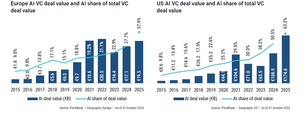 Σε ευρωπαϊκό επίπεδο, σύμφωνα με το 2026 EMEA Private Capital Outlook της PitchBook, μέσα στο 2026 η τεχνητή νοημοσύνη αναμένεται να ξεπεράσει το 50% της συνολικής αξίας των ευρωπαϊκών deals, μετατρέποντας το venture capital σε αγορά υψηλής συγκέντρωσης και υψηλού ρίσκου.