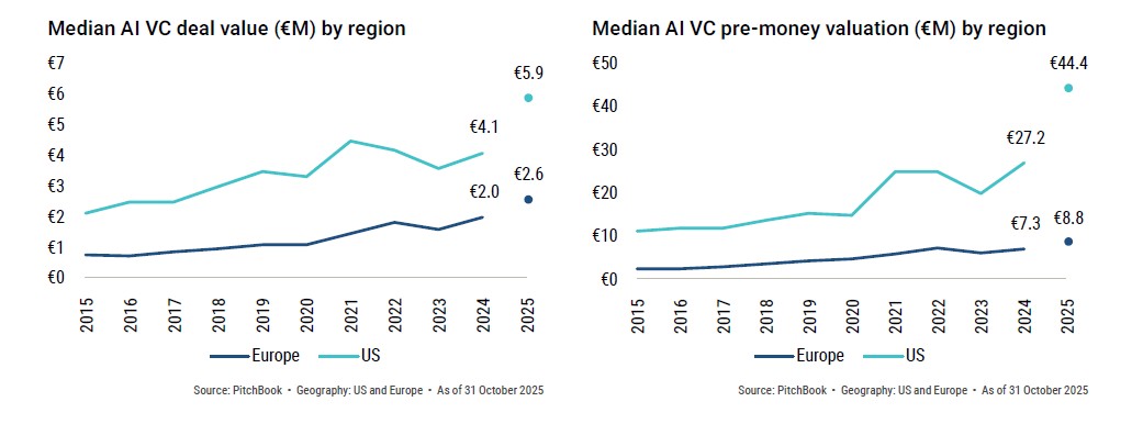 Ακόμη πιο εντυπωσιακή είναι η διαφορά στις pre-money αποτιμήσεις: 8,8 εκατ. ευρώ στην Ευρώπη, έναντι 44,4 εκατ. ευρώ στις ΗΠΑ. Η απόκλιση αυτή δεν αποθαρρύνει τους επενδυτές, αντιθέτως, λειτουργεί ως κίνητρο. Σύμφωνα με την PitchBook, η Ευρώπη εμφανίζεται ελκυστική ακριβώς επειδή οι αποτιμήσεις της AI, αν και αυξημένες, δεν έχουν φτάσει στα «φουσκωμένα» επίπεδα της αμερικανικής αγοράς. Αυτό δημιουργεί προσδοκίες για υψηλότερες αποδόσεις, ιδίως για funds που αναζητούν early ή mid-stage τοποθετήσεις.