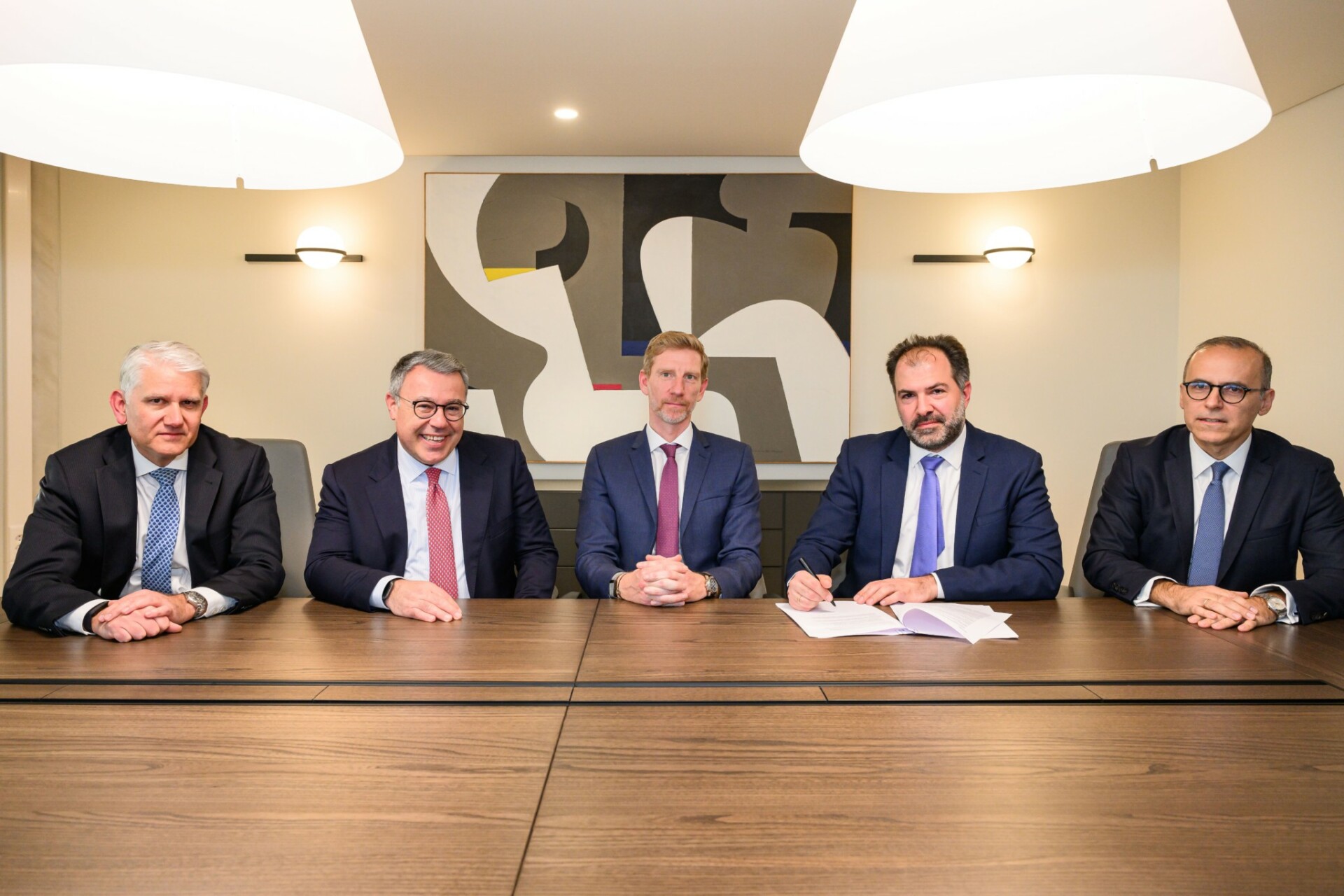 Από αριστερά: Λάζαρος Παπαγαρυφάλλου, Deputy CEO, Alpha Bank , Βασίλης Ψάλτης, Alpha Bank Group CEO, Αλέξανδρος Αλέξανδρος Κελαϊδίτης, Εκτελεστικό μέλος FlexFin, Δημήτρης Βρανόπουλος, Διευθύνοντας Σύμβουλος FlexFin, Νίκος Σαλακάς, Chief of Corporate Center and General Counsel, Alpha Bank, H ομάδα της Wealthyhood @Alpha Bank