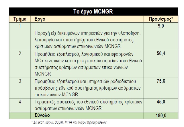 Μεγάλα ονόματα κοιτάζουν το νέο έργο Mission Critical Network GR (MCNGR), που ετοιμάζει το υπουργείο Ψηφιακής Διακυβέρνησης για τα σώματα ασφαλείας της χώρας. Πρόκειται για το νέο και αναβαθμισμένο έργο πληροφορικής και τηλεπικοινωνιών, που θ’ αντικαταστήσει το έργο Command, Control, Communications, Computers, and Intelligence (C4I) που είχε αναπτυχθεί για τους Ολυμπιακούς Αγώνες του 2004 και το οποίο πλέον θεωρείται ξεπερασμένο.