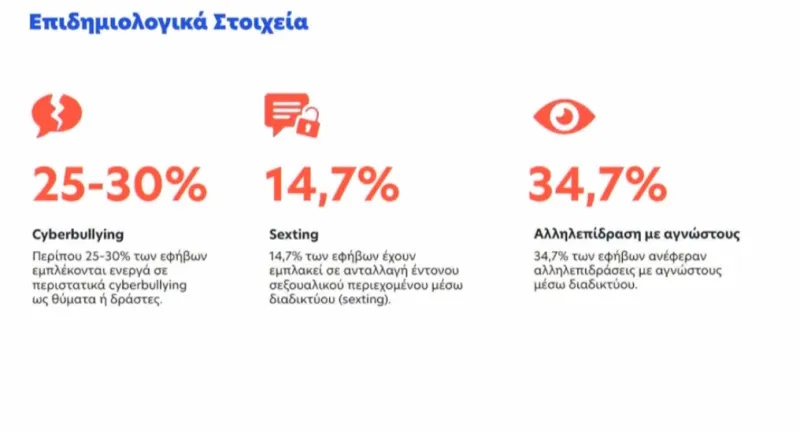 Ιδιαίτερα ανησυχητικά είναι και τα στοιχεία για επικίνδυνες συμπεριφορές: περίπου το 25-30% των εφήβων εμπλέκεται σε περιστατικά cyberbullying είτε ως θύμα είτε ως δράστης, ενώ το 14,7% έχει συμμετάσχει σε ανταλλαγή σεξουαλικού περιεχομένου μέσω διαδικτύου (sexting). Παράλληλα, το 34,7% δηλώνει ότι έχει αλληλεπιδράσει με αγνώστους στο διαδίκτυο.