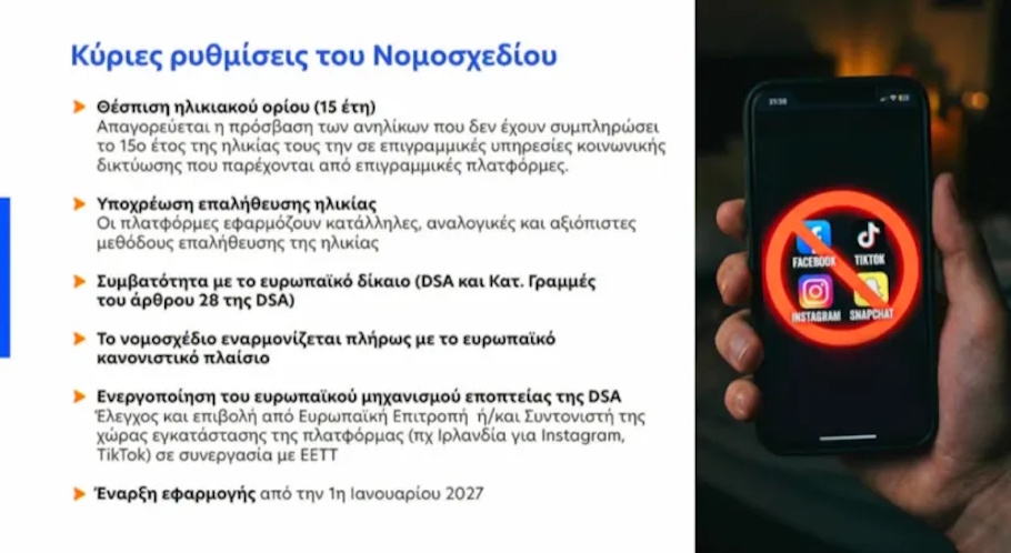 «Το νομοσχέδιο που έρχεται είναι πολύ απλό που βασίζεται στο ευρωπαϊκό πλαίσιο νομοθέτησης και λέει πως η απαγορεύεται η πρόσβαση ανηλίκων που δεν έχουν συμπληρώσει το 15ο έτος της ηλικίας τους στα social media».